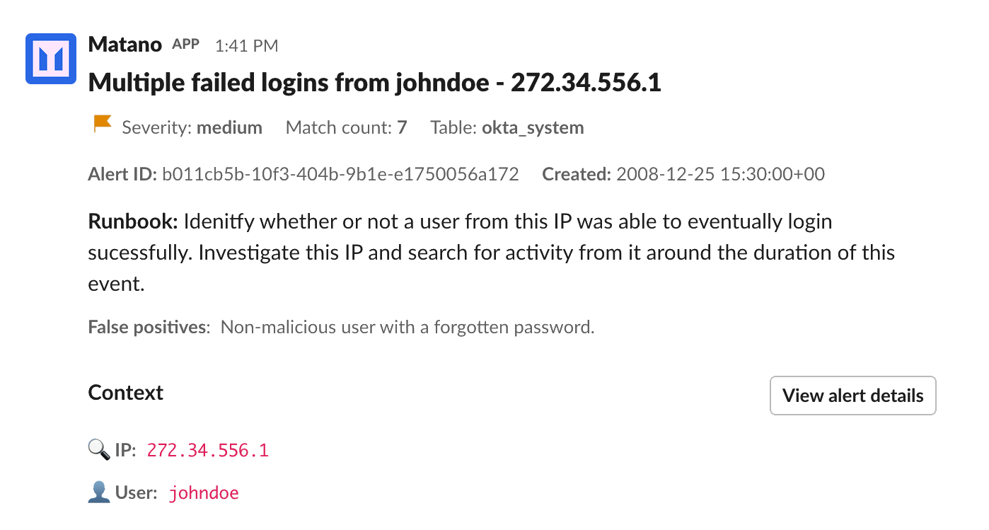 You can use the Matano Slack alerting integration to deliver alerts from your detections to your Slack channels.